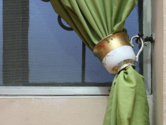 على سبيل المثال ، في المطبخ ، يمكنك استخدام الأطباق لمقطع الستارة الأصلي. للقيام بذلك ، تحتاج إلى إزالة الجزء السفلي في كوب جميل ، وتعليقه بالمقبض على خطاف متصل بالجدار أو النافذة ، وتمرير الستارة عبر الفتحة الناتجة. المقطع الزخرفي جاهز. أصبح من المألوف استخدام أدوات المائدة مثل الشوك والملاعق كمشابك للستائر. تحتاج فقط إلى ثنيها إلى النصف ، وستارة مطوية في نوع من الإمساك..