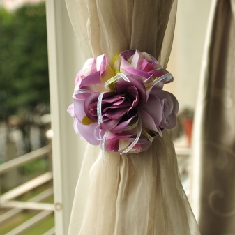 - زهور فريدة للمقاطع ، مصنوعة من شرائط, تسمى kanzashi. انتقلت هذه التقنية من تسريحات الشعر للنساء اليابانيات إلى ديكور المنزل. في الأساس ، يتم استخدام هؤلاء الحوامل مع الستائر الخفيفة..