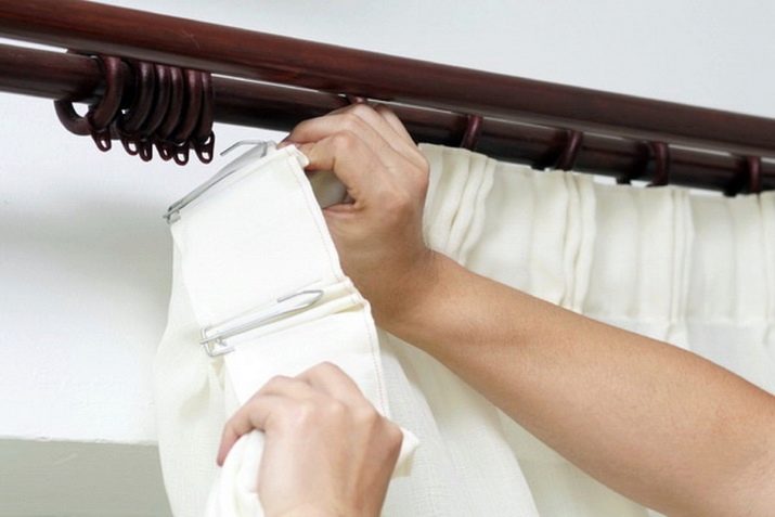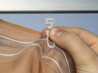 تعتبر الخطافات من أكثر أنواع تثبيت الستائر شيوعًا.. لكل بساطة هذه الطريقة ، لها أيضًا عيوب معينة: عند نقطة التعلق ، يتم شد النسيج الثقيل ، وتنكسر السنانير البلاستيكية الرقيقة ، وتكون الخصائص الزخرفية لهذا النوع من الملحقات صغيرة. يمكنك تجنب شد الخامة بتعليق الستائر على جديلة أو على شريط ستارة. المشابك جيدة لأنها تسمح لك بإصلاح الستائر بسهولة والتحكم بها باستخدام كبلات خاصة ، ومع ذلك ، لا يمكن استخدام المشابك إلا للأقمشة الخفيفة. يمكن أن تتدلى الستائر السميكة من مشابك الغسيل التي لها أسنان صغيرة. عيب هذه الطريقة هو أنه حتى مع وجود شد طفيف على القماش ، فإنه يخرج من المشبك..