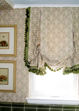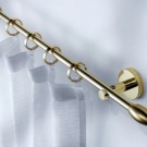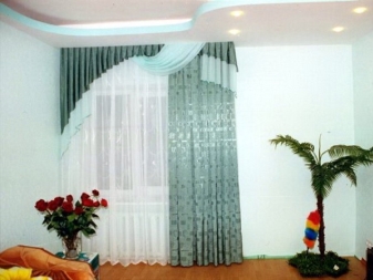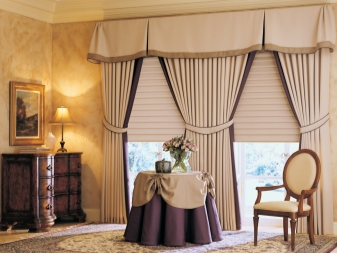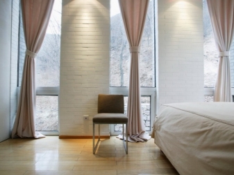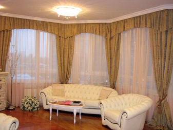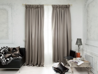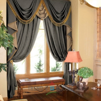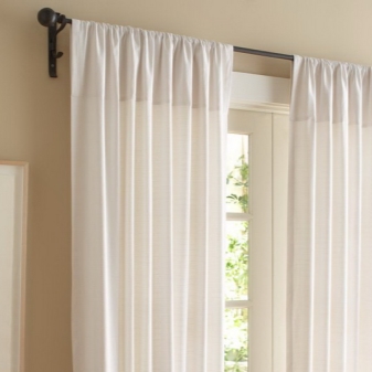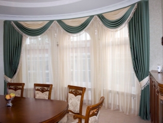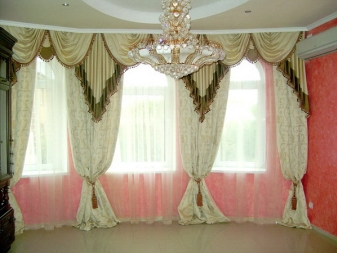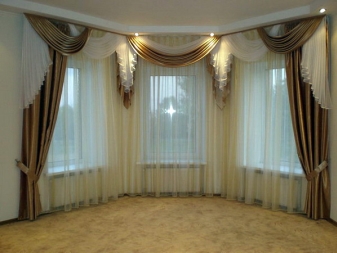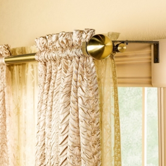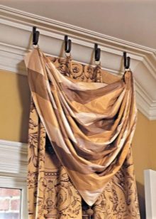 إذا كان للنافذة شكل معقد ويبدو أنه من غير المنطقي تثبيت الكورنيش ، فيمكنك استخدام حوامل زخرفية خاصة – لولبية أو خطافات معلقة عليها الستارة. نتيجة لذلك ، يتم تشكيل طيات ناعمة قذرة قليلاً.. لتجنب ارتخاء القماش ، يُنصح بإطالة الستائر بحيث تكون حافتها السفلية على الأرض..