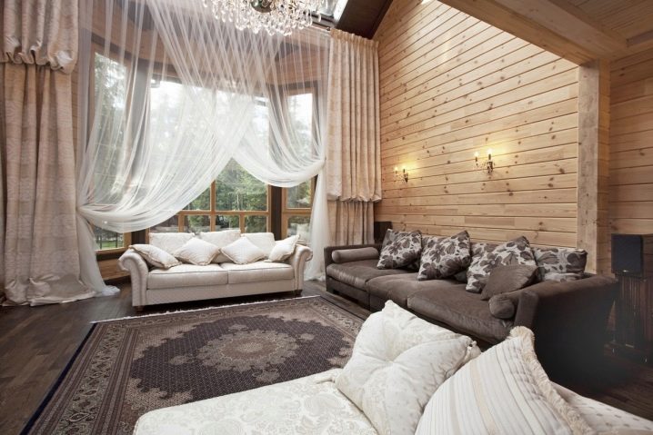 غالبًا ما توجد الهندسة المعقدة للنوافذ في المنازل الريفية في الطابق العلوي.. يؤدي الشكل غير القياسي للنافذة إلى تعقيد اختيار الستائر وطريقة تثبيت الكورنيش ، لأنها تجذب الانتباه وتتطلب حلاً بسيطًا وعضويًا. بالنسبة للنافذة المائلة ، يجب ألا تختار الستائر المورقة المعقدة للغاية – فهي أكثر صعوبة في التعامل معها ، بالإضافة إلى أنها تخفت الضوء بشكل كبير. من الأفضل اختيار قماش أفتح للمناور بحيث يحافظ على شكله جيدًا ولا ينزلق من الأفاريز.