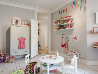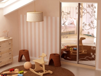 سيبدو السرير العلوي في غرفة الأطفال غير عادي وأصلي ، وستكون تحته منطقة تخزين. قد لا تحتوي الخزانة في هذه الحالة على أبواب ، ولكن يمكن إغلاقها بستارة. النسخة ذات الأبواب الانزلاقية الشفافة مناسبة أكثر لشاب ، والمظلة الرومانسية أكثر ملاءمة للفتاة..