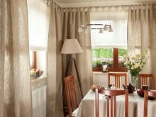 لذلك ، بالنسبة للستائر ، عادةً ما يتم استخدام الأقمشة الطبيعية فقط ، والتي تعد أيضًا مثالية للتصميم الداخلي على الطراز البيئي.. في هذه الحالة ، من الأفضل إعطاء الأفضلية للستائر الخشنة ، وكذلك الموديلات الرقيقة من التول من chintz أو calico. من المقبول إذا كانت زخرفة النافذة مزينة بنمط جميل أو دانتيل.