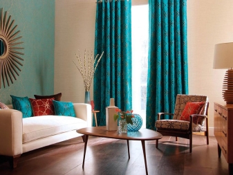 يتم اختيار زخرفة النوافذ بظلال مشرقة للغاية ومشبعة فقط إذا كانت بقية الأجزاء الداخلية للغرفة تحتوي على نفس الألوان ، على سبيل المثال ، يمكن أن تكون بطانيات أو وسائد أو سجاد. ستبدو الستائر المطابقة للنمط أو الملمس مع الأشياء الملونة الأخرى في الغرفة أيضًا أنيقة للغاية..