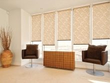 الستائر الرومانية مطلوبة أيضًا ، فهي تبدو مثل الأقمشة الصلبة المستطيلة الشكل. عند الصعود وتجميعها بالكامل ، فإنها تأخذ شكل طيات أفقية. تتوافق هذه الستائر مع جميع مبادئ بساطتها..