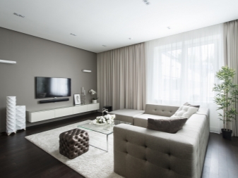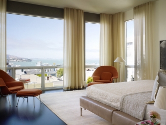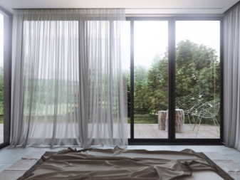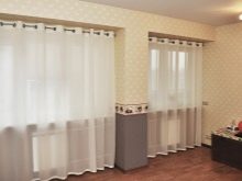 الخيار التالي لتصميم النوافذ العصري هو ستائر شفافة واسعة لا تلتقط النافذة فحسب ، بل تلتقط أيضًا جزءًا من الحائط. يمكنك حتى تعليقها بطول الحائط بالكامل. لن تتداخل هذه الستائر مع تغلغل الضوء في الغرفة وتخلق جوًا لطيفًا ومريحًا. نظرًا لخفة المواد وشفافيتها ، فإن زخرفة النوافذ والجدران هذه ستزيد بصريًا من أبعاد الغرفة. يمكنك اختيار تول من أي لون على الإطلاق ، ولكن يفضل أن يكون بدون نقش ، حيث يمكنه تحميل الغرفة بتفاصيل غير ضرورية.