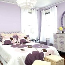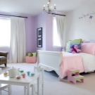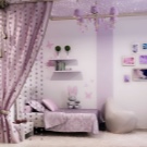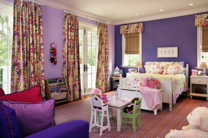 - ينصح المصممون بعدم استخدام لون أرجواني في غرفة نوم الأطفال بكميات كبيرة جدًا ، لأن وفرة هذا اللون لا تؤثر على نفسية الطفل بأفضل طريقة. يصبح الأطفال عصبيين ، وينامون بشكل سيئ. ولكن إذا كانت الجدران في غرفة أصغر المنازل مزينة بهذا التصميم بالضبط ، فيجب اختيار الستائر بظلال ناعمة – خضراء فاتحة ، سماوية. يُسمح بوجود رسم ، يمكن أن يكون شريطًا رأسيًا أو صورًا لشخصيات الكارتون المفضلة لديك.