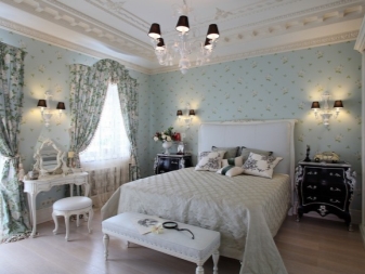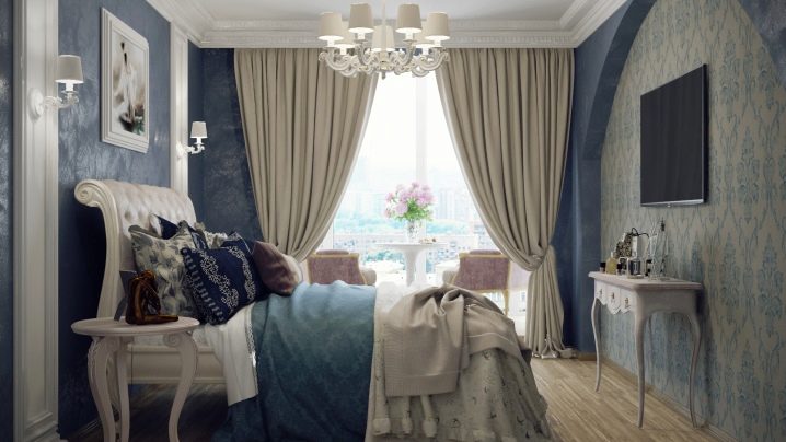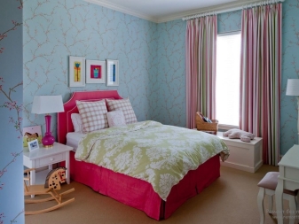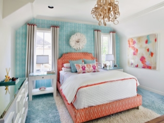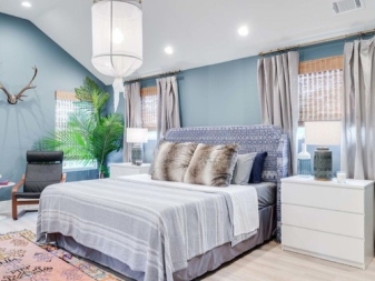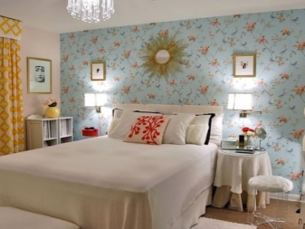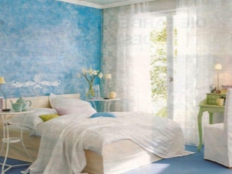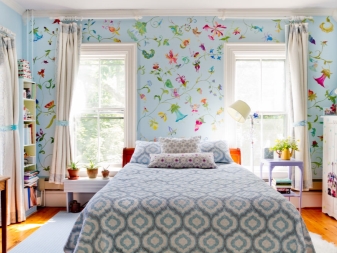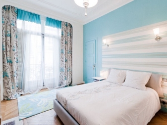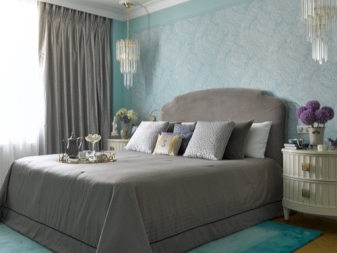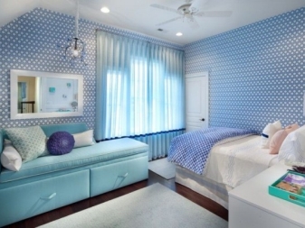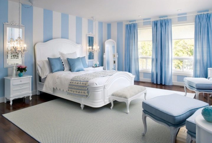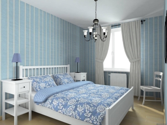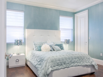 غرفة النوم مخصصة في المقام الأول للاسترخاء. من الضروري هنا خلق جو من الهدوء والاسترخاء والراحة القصوى. لمثل هذه الغرفة الألوان الفاتحة اللطيفة أكثر ملاءمة. يمكن دمج ورق الحائط الأزرق في غرفة النوم مع الستائر ذات اللون الأبيض الثلجي. أي ظلال باستيل مناسبة أيضًا ، وليست أنماطًا متنوعة جدًا..