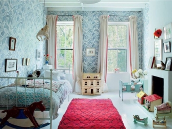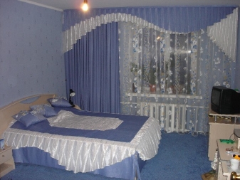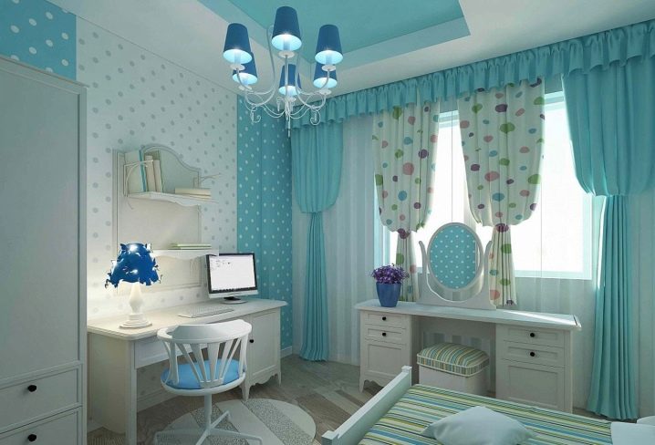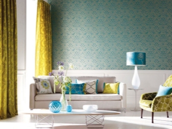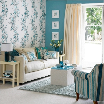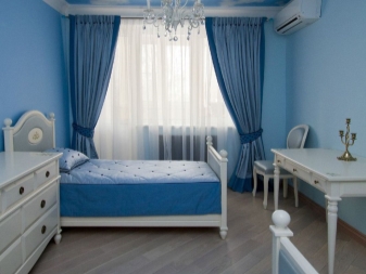 تذكر أنه مع ورق الحائط الأزرق العادي ، يجب أن تكون الستائر أفتح أو أغمق قليلاً ، وإلا ستبدو الغرفة مملة. الاستثناء هو مجموعات الستائر التي تشمل التول. في هذه الحالة ، يمكن أن تتطابق المادة الرئيسية للستائر مع نغمة ورق الحائط. حيث يجب أن يكون التول أبيض. بهذه الطريقة يمكنك الحفاظ على توازن النغمات ونقاء اللون..