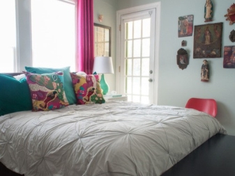 هذا الخيار رائع لغرفة المعيشة. في غرفة النوم ، سيكون السطوع المفرط غير مناسب. أما بالنسبة للظلال الأخرى في مثل هذا الجزء الداخلي ، فسيكون الأبيض رفيقًا مثاليًا لمزيج من الأزرق والأحمر. سيجعل الجو أفتح وأكثر تناسقًا ، ويوازن توازن اللون.