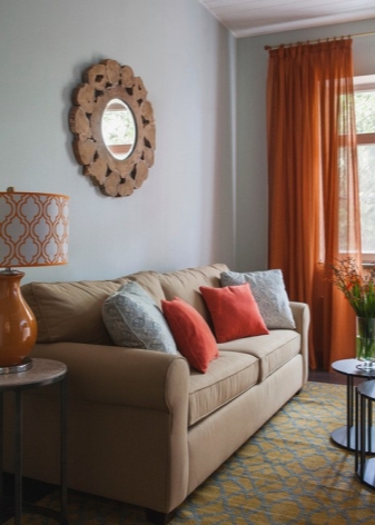 - إذا كان هناك ظلالان رئيسيتان في الإعداد ، فيمكنك اختيار أحدهما بأمان للستائر. يمكن أن يكون لون الأثاث المنجد أو ظل بعض العناصر الداخلية. إذا كان نظام الألوان متنوعًا ، فيمكن مطابقة نغمة الستائر مع اللون السائد.
