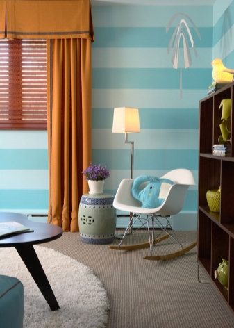 ستساعد الستائر ذات الخطوط العمودية (باللونين الأبيض والأزرق أو بألوان أخرى) على زيادة ارتفاع السقف بصريًا. يوفر وجود خطوط أفقية على الستائر توسعًا بصريًا للمساحة. هذه التقنية مفيدة لتزيين غرفة ضيقة..