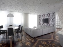 إذا اخترت اللون الأبيض باعتباره اللون الرئيسي في الغرفة ، فهذا لا يعني على الإطلاق أنك الآن بحاجة بالتأكيد إلى تحديد لهجات مشرقة. ستبدو غرفة المعيشة المزينة باللون الأبيض ، بما في ذلك ورق الحائط والستائر ، متطورة وفاخرة. الأبيض النقي يبدو باهظ الثمن دائمًا.