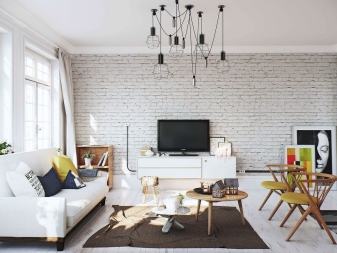- إذا لم تكن التدفقات الصامتة مناسبة لك ، فسيكون الخيار الجيد هو التركيز على الأثاث البني الغامق وعناصر الديكور الساطعة (الستائر والوسائد وما إلى ذلك). سوف يعمل الجرافيت أو القهوة أو اللون الأصفر على إبراز اللون الأبيض الداخلي بنجاح.