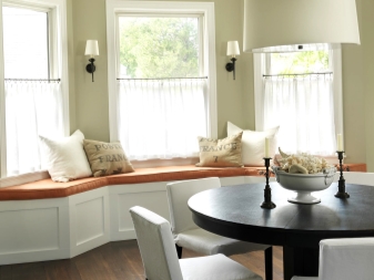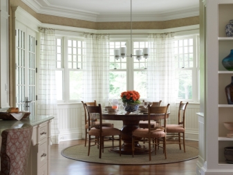 إذا كنت تخطط لوضع طاولة بها كراسي في هذه المنطقة ، فيجب أن تضع في اعتبارك أننا لسنا دائمًا حريصين على الطعام. لذلك ، لا يتم تشريب الستائر برائحة الطعام فحسب ، بل تتسخ أيضًا بشكل أسرع من الغرف الأخرى. يجب استخدام ستائر منطقة تناول الطعام بالقرب من نافذة الخليج غير مكلفة ، ولكن جيدة قدر الإمكان. هناك ، على سبيل المثال ، أقمشة ذات تشريب طارد للماء. من الأسهل تنظيفها من الأوساخ دون غسلها.