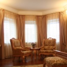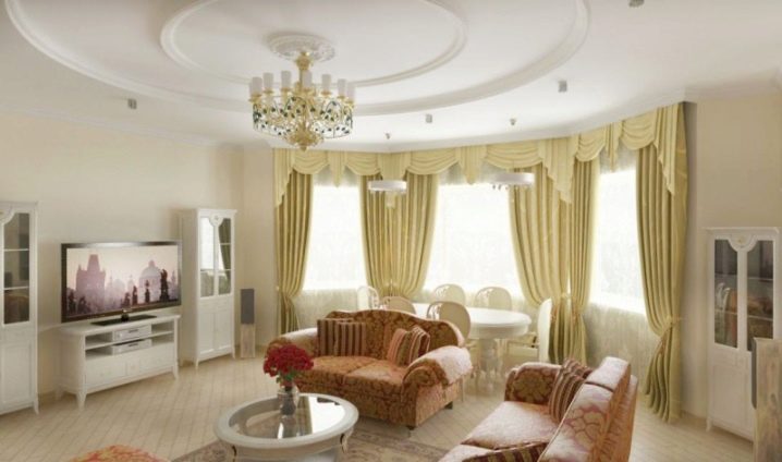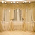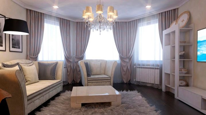 تزيين غرفة المعيشة بأسلوب كلاسيكي ، يمكنك تزيين نافذة الخليج بستائر نمساوية سميكة بلون غامق غني أو ستائر ثقيلة بأربطة. غالبًا ما تستخدم هذه الستائر عند تزيين الستائر التي لا تفتح للتهوية. أيضا ، ستائر من هذا النوع تخفي المظهر الخارجي القبيح خارج النافذة. بالإضافة إلى ذلك ، فهي مريحة للاستخدام أيضًا لأنها لا تسمح للضوء بالتسلل من الشارع إلى الغرفة. لذلك ، إذا كنت تستخدم غرفة المعيشة أيضًا كمكان للنوم ، فلن يتداخل شيء مع راحتك الجيدة..