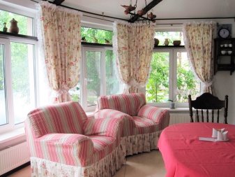 إذا كنت ترغب في إنشاء ركن رومانسي أو مكان للتجمعات العائلية في غرفة المعيشة الخاصة بك ، فإن الستائر على طراز بروفانس مناسبة لك. هذا مزيج من التول الخفيف مع الستائر الخفيفة بألوان الباستيل. يمكن أيضًا تزيينها بأنماط نباتية سرية. اختر مواد خفيفة الوزن للستائر – chintz والكتان والقطن. يجب أن يتركوا الضوء ولا يثقلوا النافذة والمساحة المجاورة لها..