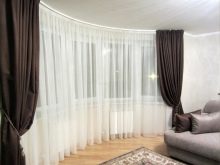 إذا كان لديك غرفة معيشة صغيرة ولا يوجد الكثير من الأماكن لمنطقة الاستجمام ، فلا يجب أن تشغلها بستائر سميكة ذات طيات عديدة. من الأفضل أن تنتبه إلى الستائر الخفيفة والتول الشفافة. هم ، على الرغم من بساطتهم الخارجية ، يجعلون الغرفة جميلة وأنيقة. ستساعد مثل هذه الخطوة أيضًا أولئك الذين تزخر غرفهم بأثاث غير ضروري..