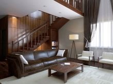يحتفظ الكوخ المصمم على طراز الشاليه ، والمكيف مع الهندسة المعمارية الحضرية ، بالقوانين الأساسية لنزل الصيد الاسكتلندي – سقف مائل مع منحدر قوي ونفس الهندسة في الداخل. صف مزدوج من النوافذ يتبع بالضبط مخطط السقف. قرر المصمم أن يكسو النافذة الفرنسية البانورامية قليلاً فقط مع ستائر من الكتان بلون الباستيل وستائر سوداء شفافة. تخلق الحزم السوداء والمصابيح ذات الطراز العلوي والستائر المدمجة مجموعة رسومية.