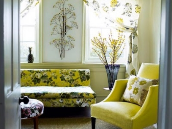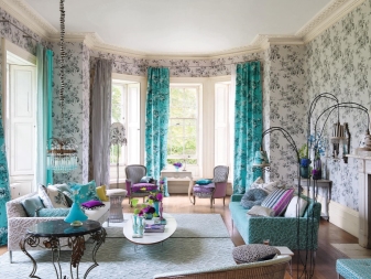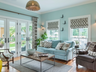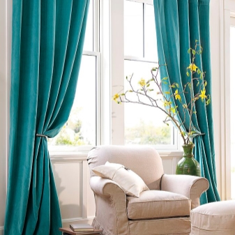 الستائر ذات اللون الأزرق الفاتح عمليا لا تتداخل مع مراقبة البانوراما ؛ يمكن تمثيل عنصر التمييز الرئيسي في هذه الحالة بواسطة ستائر صفراء ، مجمعة ومربوطة بنوع من اللفة.