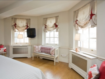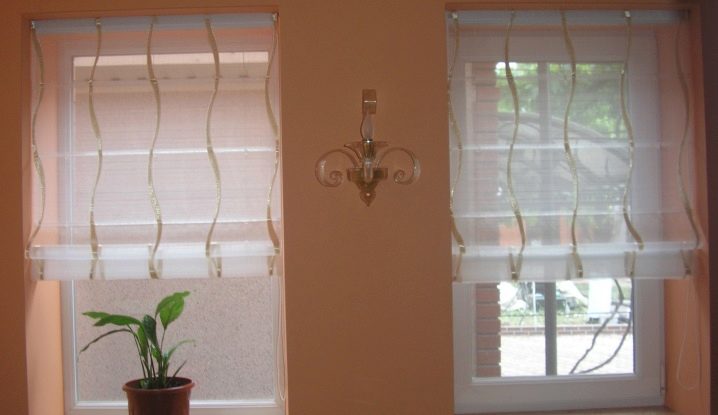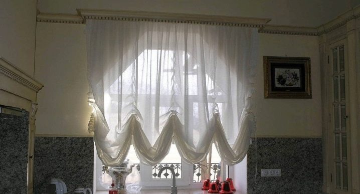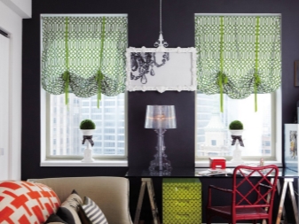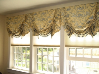 سيبدو النموذج بشكل متناغم مع النوافذ التي تحتوي على عدة شرائط. في مساحة نافذة صغيرة ، تبدو هذه الستائر بلا طعم ورخيصة. التصميم عالمي في أدائه. إنه مناسب لكل من الباروك والريف.