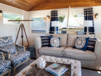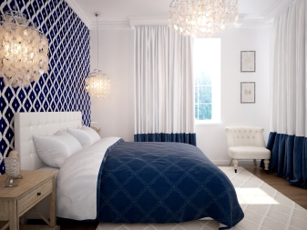هذا النمط مشرق وغير عادي. تبدو رائعة في الغرف الجنوبية. مزيج من الظلال الزرقاء والبيضاء يضيف نضارة ووجود الصيف الخالد إلى الجو..