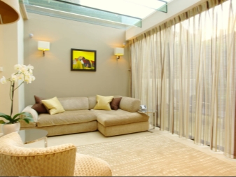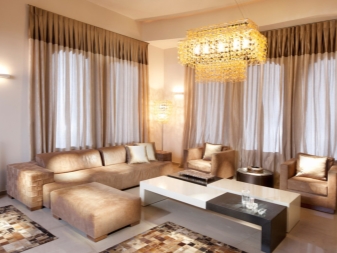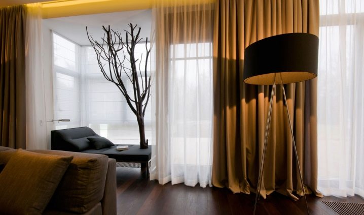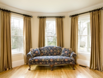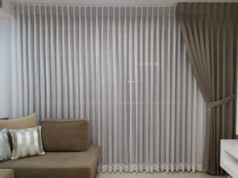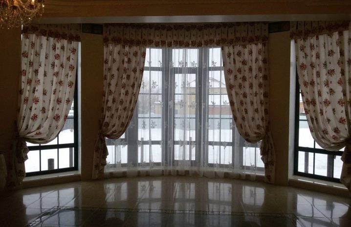ستائر طويلة مع تول متعدد الطبقات معلقة على نوافذ بانورامية أو مقوسة في القاعة. يمكن وضع اللوحات القماشية النمساوية أو الستائر الدوارة على نافذة الزاوية.