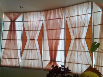 - الستائر غير القياسية مصنوعة لنوافذ ناتئة مثلثة. يتم تعليقها بدون إفريز على خط صيد خاص..