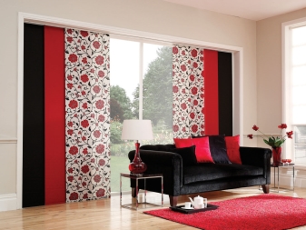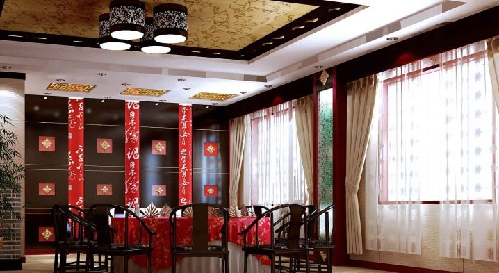 لتصميم الستائر الصينية ، يتم استخدام حجاب شفاف متعدد الألوان أو مواد حريرية. ولكن بالنسبة للتغميق ، من الأفضل إعطاء الأفضلية للأقمشة ذات اللباد الخشنة. لا يمكن دمج هذه النماذج مع الستائر الأخرى..