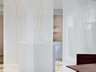 - يمكن تحديد الخيارات الأنيقة ليس فقط لغرف المعيشة ، ولكن أيضًا لمنطقة المدخل.. اللوحات في الممر مصنوعة من مواد شفافة وخفيفة الوزن. في الطول ، بالكاد يلمسوا عتبة النافذة. بمساعدة الأشرطة من الأشرطة ، يتم تثبيتها على الحائط بحيث يضيء ضوء الشمس الغرفة أثناء النهار..