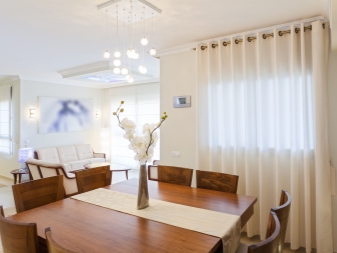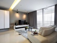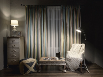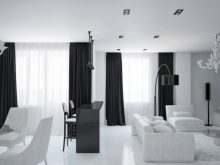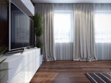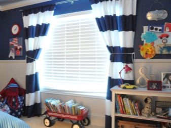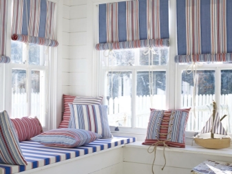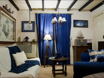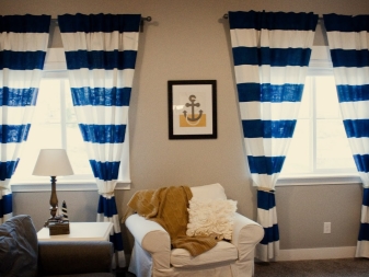 تحتوي غرفة النوم على ستائر بيضاء ذات نسيج كثيف. وفي غرفة المعيشة ، ستائر زرقاء داكنة مع خطوط فاتحة هي الأنسب..