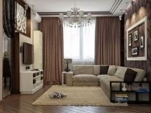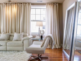 إذا لم تكن غرفة المعيشة كبيرة جدًا ، إذن بمساعدة الستائر الأنيقة ، يمكنك دائمًا جعلها أكثر بصريًا. لهذا الغرض ، يمكنك اختيار أقمشة أحادية اللون بألوان فاتحة أو ستائر مطبوعة صغيرة..