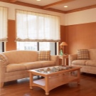 - شيوع. لا ينبغي أن يكون نسيج منتجات النوافذ جذابًا هنا ، ويتم اختيار المواد جيدة التهوية قدر الإمكان. أقمشة الديباج والمخمل مستبعدة تماما. تهيمن الظلال الناعمة والدافئة على جانب اللون مع هيمنة اللون الأبيض..
