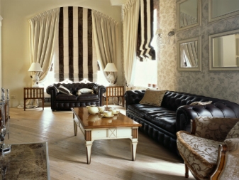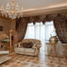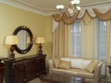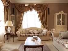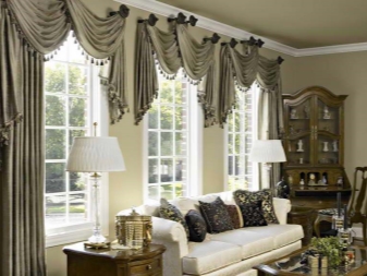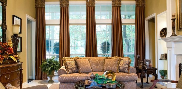 من الأفضل تزيين غرف المعيشة الكبيرة بستائر مصنوعة من أقمشة كثيفة للغاية ، والتي تحتوي أيضًا على لامبريكين ثقيل وهائل ، وكشكشة وشرابات قصيرة.