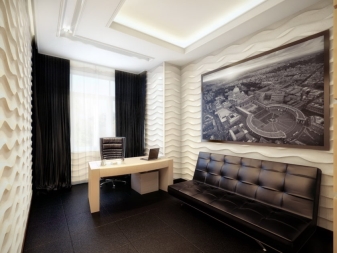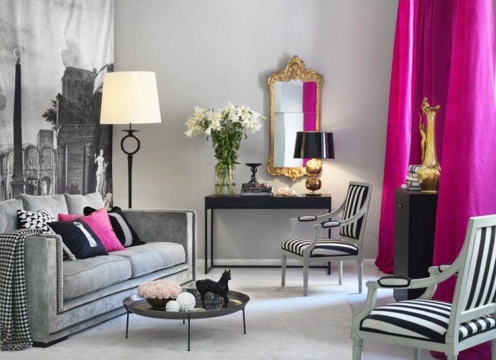 يمكن أن تكون المنتجات بالأبيض والأسود هي العنصر الأكثر لفتًا للنظر في الداخل على خلفية النغمة المعتادة للجدران والأريكة الجلدية ذات اللون الأسود المزرق. تحت أغطية الجدران الوردية ، يمكنك اختيار كل من الستائر الرمادية ذات الظلال المختلفة والستائر البيضاء والوردي. الألوان الهادئة من الخوخ والأزرق اللبني والأصفر مناسبة لزاوية ناعمة أرجوانية أو أرجوانية..