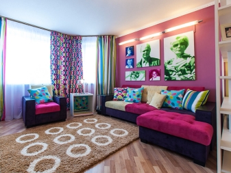 - فن البوب. في غرفة المعيشة أو القاعة المصممة أصلاً ، يجدر استخدام الستائر بألوان زاهية أو حتى نيون. منتجات الأورجانزا مثالية. يمكنك الجمع بين عدد من خطوط القماش بألوان متناقضة. الستائر المطبوعة هي الموضة اليوم..