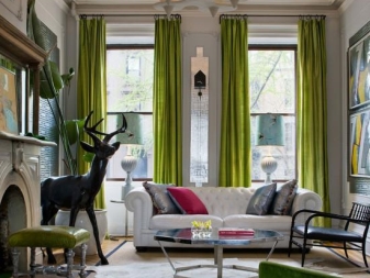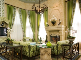 غالبًا ما يتم “تخفيف” الستائر الخضراء بأدوات متعددة الألوان من اللون الوردي أو الأصفر. يسمى الخيار الأفضل بمزيج من اللون الأخضر مع البني أو مع صبغة رملية زاهية. تزيين غرفة الضيوف هذه بلون الشوكولاتة بلمسة خضراء أمر عصري للغاية وأصلي..