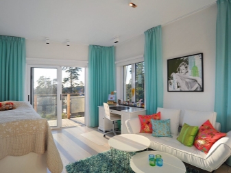 من المهم أن تكون أغطية الجدران والستائر من نفس اللون ، ولكن في نفس الوقت تكون منتجات النوافذ أخف وزناً: وبهذه الطريقة لن تضيع على الجدران ، وستزداد الغرفة بصريًا.