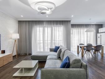 بالنسبة لغرفة المعيشة ذات الحجم الكبير ، حيث يوجد الكثير من الضوء من شمس النهار ، يمكنك شراء الستائر الداكنة والستائر التي ستحمي المساحة من الحرارة الزائدة. يجب أن تتذكر جميع العوامل المذكورة أعلاه عند اختيار الستائر من أجل اتخاذ القرار الصحيح..