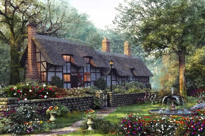 إذا كنت ترغب في أخذ استراحة من الجو الحضري في الريف ، فسيكون هذا الخيار هو الأفضل لك. محور هذه المؤامرة هو منزل ريفي. تضفي النوافذ الصغيرة ذات الجدران المنخفضة والسقف المصنوع من القش طابعًا قديمًا. المنزل محاط بالزهور الزاهية. لا توجد نباتات متقزمة فحسب ، بل نباتات متسلقة أيضًا..
