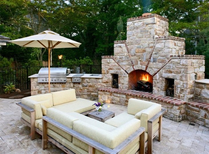 المادة الرئيسية هنا هي حجر خفيف. ليس فقط قاعدة الشرفة والسور المنخفض ، ولكن أيضًا مدفأة خارجية ضخمة مصنوعة منها. مقابل المدفأة يوجد نفس الأثاث الخفيف: عدة أرائك مريحة وطاولة خشبية ومظلة شاطئ تحمي من أشعة الشمس الحارقة.