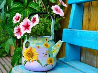 قد تعمل غلاية أو قدر قديمة كزارع.. يكفي التخلص من الصدأ من طبقة الطلاء القديمة المتقشرة وكل ما قد يتدخل. يمكنك ترتيب أدوات المطبخ غير الضرورية بأي طريقة. بالطبع ، أسهلها هو الرسم. هنا يمكنك إظهار خيالك بأمان ورسم أي أنماط ورسومات. قد يكون مثل هذا المنتج بمثابة وعاء مستقل يمكنك من خلاله زراعة نباتك المفضل. عادة ما تكون هذه المنتجات مشرقة ومبهجة وتبدو غير عادية في الحديقة..