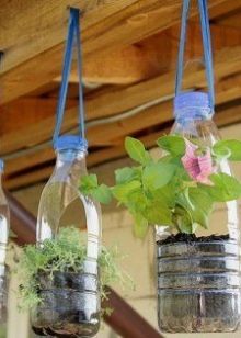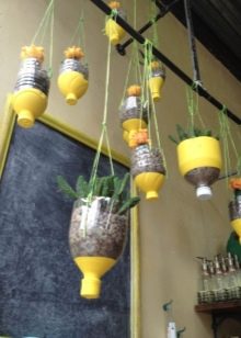 يمكنك أيضًا صنع أصيص معلق أصلي من الزجاجات البلاستيكية., حيث ستبدو النباتات مثيرة للإعجاب وغير عادية. لكي تصنعها بنفسك ، ستحتاج إلى: حبل ومقص حاد وعدة زجاجات بلاستيكية سعة 5 لتر. بالطبع ، من الممكن تمامًا تناول 3 لترات. كل هذا يتوقف على نوع أواني الزهور التي تخطط لوضعها في هذا المنتج..