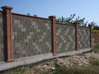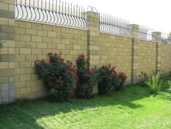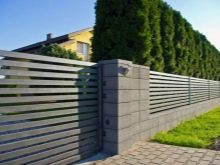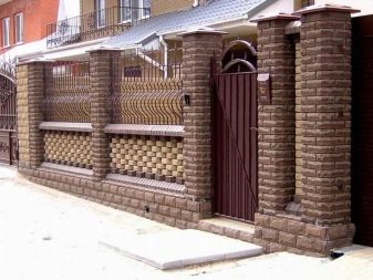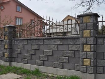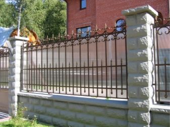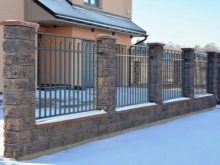 يمثل السياج مالك العقار للعالم المحيط بأكمله ، لذلك لا ينبغي أن يكون موثوقًا به فحسب ، بل يجب أن يكون جذابًا أيضًا من الناحية الجمالية. في الصورة الأولى ، يمكنك أن ترى كيف يتم تحسين حتى الكتل الملساء العادية إذا تم تقسيم الهيكل بواسطة أعمدة من مادة منقوشة ومزينة بشواية معدنية في الأعلى..