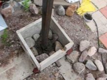 - تركيب أعمدة الدعم وصبغها بالخرسانة. أولاً ، تحتاج إلى تحديد المسافة التي ستوضع فيها الرفوف عن بعضها البعض ، وحفر ثقوب لكل منها. وعادة ما تكون المسافة بين الأعمدة 2.5-3 م ، والعمق الموصى به هو 1.3 م أو 1/3 – 1/4 من الطول الإجمالي للدعامة. يجب ألا يقل سمك وسادة الرمل والحصى عن 100-150 مم. بادئ ذي بدء ، يتم وضع الدعامات في زوايا المحيط ، ثم على جانبي البوابة والبوابة. يجب التحقق من الارتفاع حول المحيط بأكمله بمستوى.