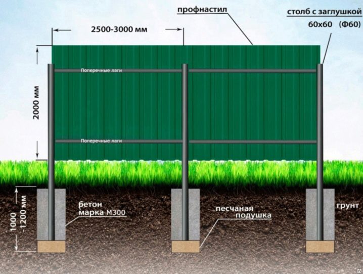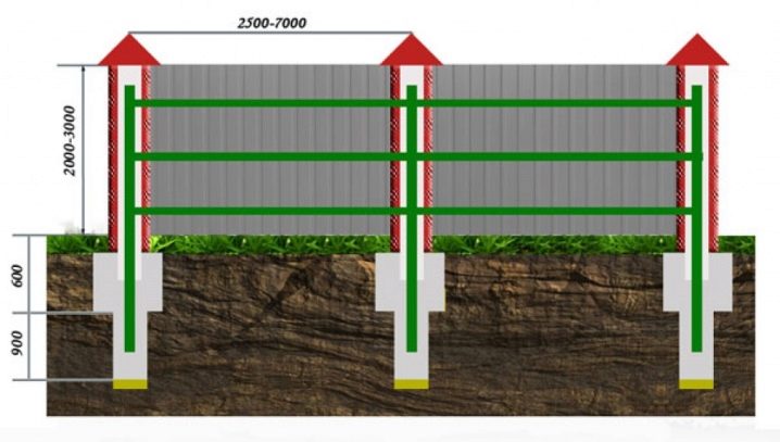 عادة ما تكون المسافة بين الدعامات 2-3 أمتار. في المناطق ذات الرياح القوية ، يجدر تقليل هذه الفجوة. عند حساب عدد الأعمدة ، يجب مراعاة وجوب وضع الدعامات عند زوايا المحيط وعلى جانبي البوابة أو البوابة.