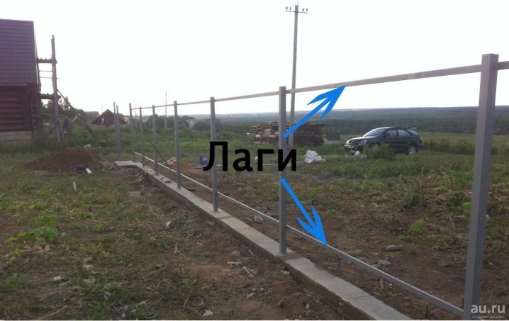 ومع ذلك ، إذا كانت هناك رغبة في إقامة سياج مقطعي بأعمدة ، فسيكون من الضروري التأكد من دخول ورقة واحدة من الألواح المموجة في كل قسم. من الأفضل أيضًا استخدام الأنابيب المموجة مثل وصلات العبور المتأخرة. تحديد العدد المطلوب منها أمر بسيط: لهذا تحتاج إلى مضاعفة العدد الإجمالي للأشرطة المتقاطعة بمحيط السياج. يتم امتلاك معلمات القوة المثلى بواسطة سجلات بأبعاد 40x25x2 مم.