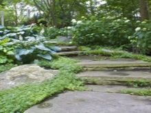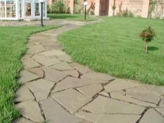 هناك عدة أنواع من الحجر الطبيعي: لائحة ، كوارتزيت ، جرانيت ، حجر رملي ، شونجيت. يخلق الحجر على فترات مملوءة بعشب العشب انتقالًا دافئًا ومريحًا عبر المنطقة. تشمل عيوب هذا الرصف التكلفة العالية للمادة. بالنسبة لخيار الميزانية ، من الأفضل استخدام ألواح الرصف..