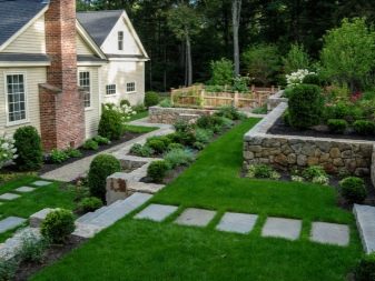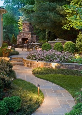 عند التخطيط لمسارات المشي ، عليك التأكد من أن المسار لا يصطدم بالسياج. إذا كان لا يمكن تجنب ذلك ، في نهاية المسار يرتبون بوابة زائفة ، قوس مع مقعد ، فراش زهرة. لا تخف من التضاريس على الموقع: الخطوات المصنوعة من الصخور الكبيرة أو العوارض الخرسانية تضيف سحرًا وسحرًا لتصميم المناظر الطبيعية. أحد التفاصيل المهمة هو التصميم التكنولوجي المختص للخطوات: يجب أن يكون المشي عليها مريحًا..