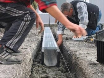 يتم تسوية الجزء السفلي من الخندق وفحصه على مستوى المبنى حتى لا توجد ثقوب وانتفاخات. من الضروري مراقبة المنحدر العام لمسار تصريف المياه (5 درجات). إذا كان هذا المنحدر غير ممكن ، فقم بتوفير منحدرات قطعة القماش من مادة التشطيب على الجانبين (من 5 إلى 15 درجة). يتم حشو الجزء السفلي من الخندق بسجل بقضيب مسمر أو دك ميكانيكي.